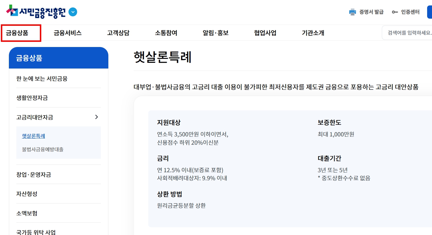 대표적인 정책 상품은 서민금융진흥원에서 확인할 수 있으며, 상품별로 조건과 금리가 다르게 적용됩니다.