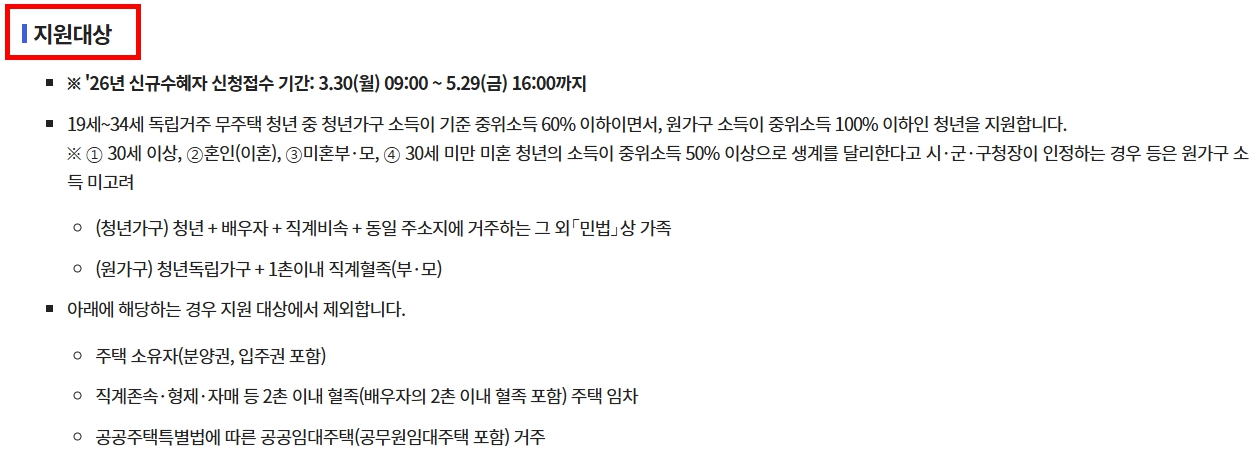 | 소득 기준 | 청년 60% / 부모 포함 100% 이하 |